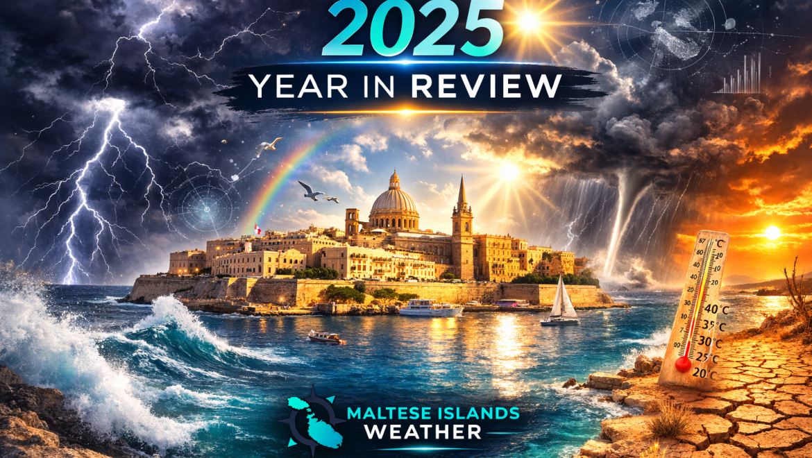 2025 was the first year since 2021 to register more rainfall than is expected. It was also only the fourth wetter than average year since 2010. With a total of 631.5 mm of rain, 2025 was also the wettest since 2012. The year was characterized by a good late wet winter and a long, rainy spring which extended right until the start of summer. Autumn drew a great contrast between the two islands. Downpours drenched Gozo but missed Malta almost entirely. Whilst Malta failed to enjoy a wet autumn month, the stormy weather only failed to reach Gozo in November. December was dotted with rainy days, helping it become the first one with more rainfall than the norm in eleven years! The 100 mm mark was reached on three months. The highest 24-hour rainfall total was reported on 24th September, when an afternoon isolated thunderstorm and an evening thunderstorm drenched Gozo with 60.4 mm of rain.