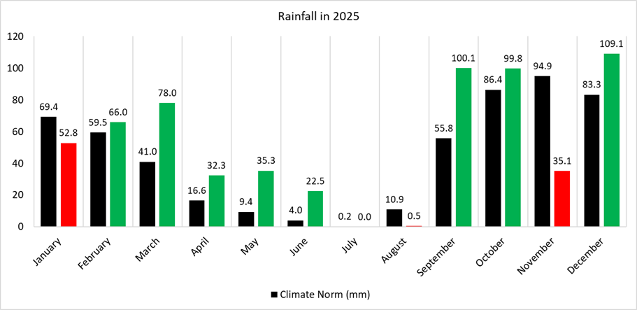 Overall, the year 2025 was 0.4˚C warmer than the norm. Mean maximum and mean minimum temperatures surpassed the average by 0.6˚C and 0.5˚C respectively. The early onset of upper level instability in late summer contributed towards abundant autumnal instability which in turn resulted in cooler temperatures across the region.