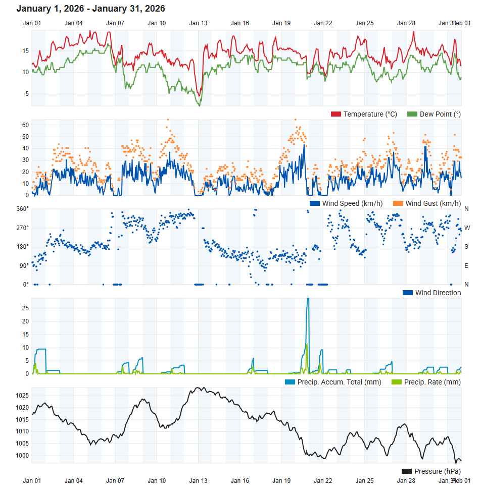 January 2026 was characterized by anomalously mild, humid and wet conditions. The mean air temperature, at 14.1°C, was 1.3°C above the climatological norm. This anomaly is evident in both daytime and night-time values, with a mean maximum of 16.6°C (+1.0°C) and a mean minimum of 11.5°C (+1.4°C). The warmest day occurred on the 5th (19.7°C), while the lowest minimum of the month, 4.1°C, was recorded on the 13th during a brief clearer and calmer interval.